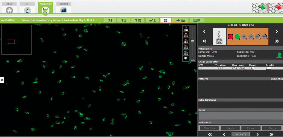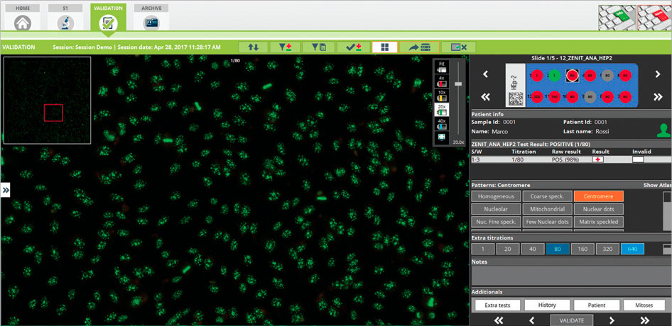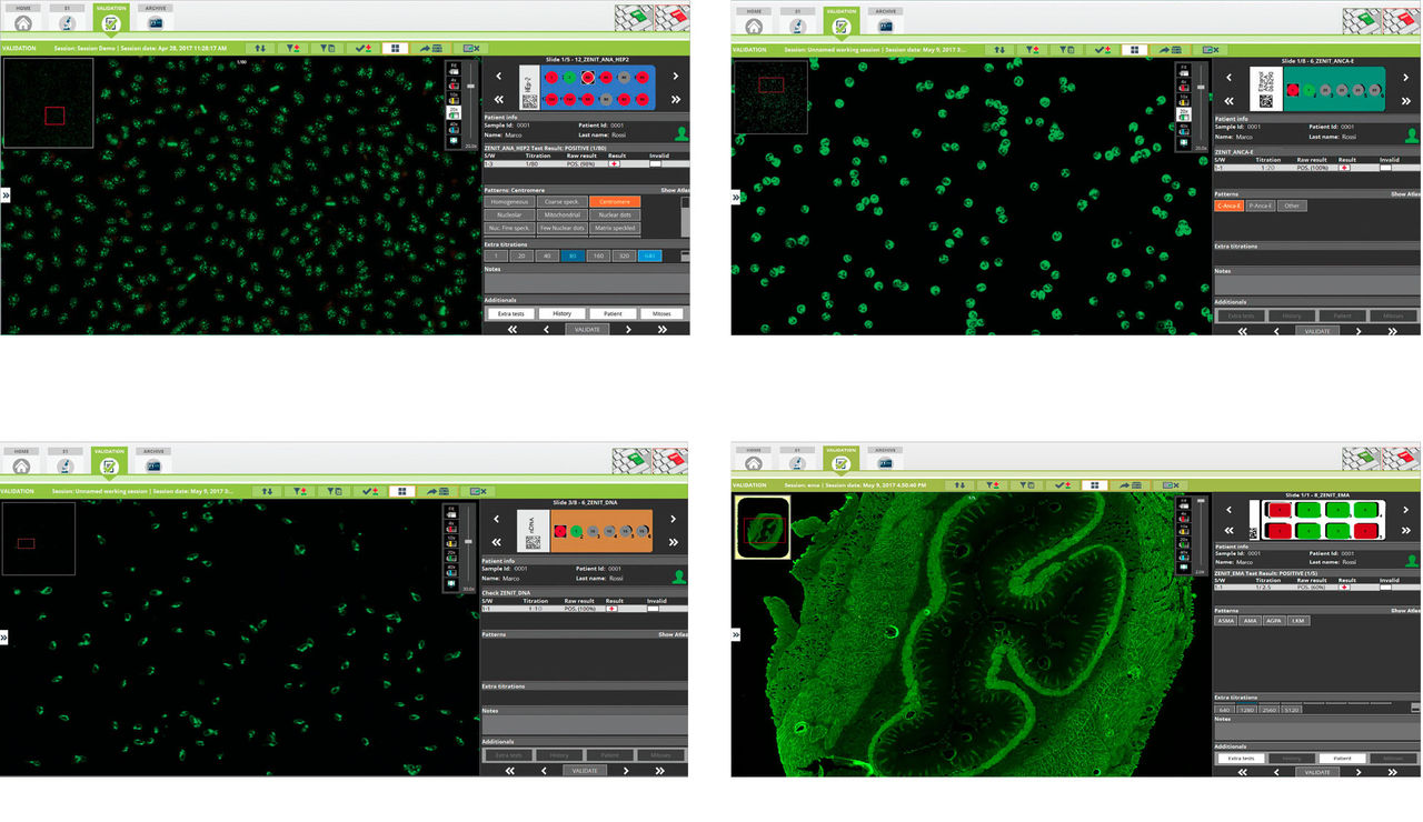 The system performs automatic classification of positive/negative results for Zenit ANA HEp-2 tests measuring the intensity of fluorescence for each positive test and provides pattern recognition on positive results (see detected patterns in the Technical Data section). Mitosis recognition is also performed on identified patterns.