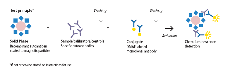 Parameter/assay principle: Quantitative detection of IgG antibodies to dsDNA, centromere B, SS-A/Ro (60 kDa and 52 kDa), SS-B/La, Sm, U1-snRNP (70 kDa, A and C), Scl-70 and Jo-1