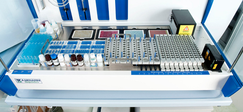 Automate complet pour la réalisation de tests en techniques ELISA et IFA. L’instrument peut combiner 4 microplaques ELISA et 16 lames IFA simultanément dans la même session de travail ; jusqu’à 10 paramètres différents peuvent être réalisés par série
