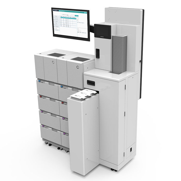 Au moment où le patient est scanné et accepté par la borne d’enregistrement du GNT9, le patient peut obtenir son propre matériel de prélèvement. Le préleveur - de l'autre côté du GNT9 - peut s’occuper d’un autre patient et obtenir un autre kit du convoyeur via un logiciel séparé. Les patients peuvent utiliser le GNT9 pour obtenir les tubes et les étiquettes supplémentaires nécessaires dans un kit (scellé ou non scellé).