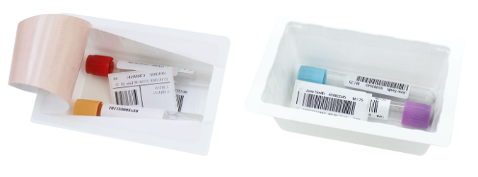 Le KBU fournit un kit de prélèvement contenant des tubes étiquetés, des étiquettes supplémentaires et une étiquette de confirmation du patient.